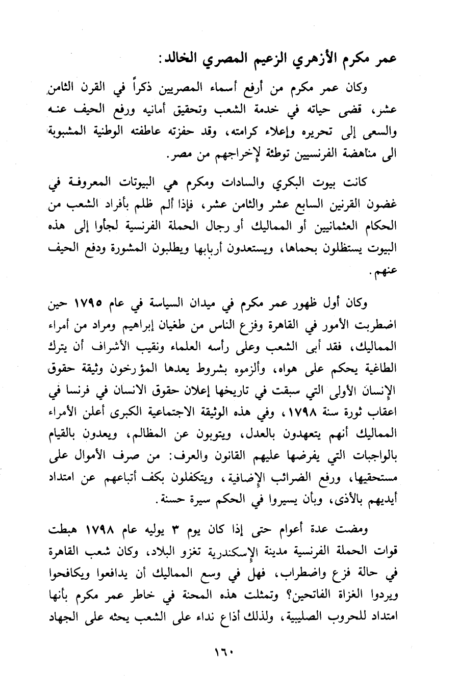 وكان عمر مكرم من أرفع أسماء المصريين ذكرا في القرن الثامن عشر، قضى حياته في خدمة الشعب وتحقيق أمانيه ورفع الحيف عنه والسعى إلى تحريره وإعلاء كرامته، وقد حفزته عاطفته الوطنية المشبوبة الى منأهضة الفرنسيين توطئة لإخراجهم من مصر.