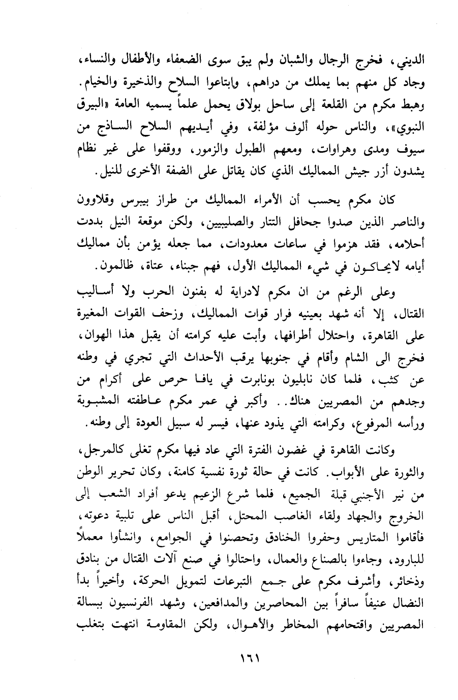 وكانت القاهرة في غضون الفترة التي عاد فيها مكرم تغلى كالمرجل، والثورة على الأبواب. كانت في حالة ثورة نفسية كامنة، وكان تحرير الوطن من نير الأجنبي قبلة الجميع، فلما شرع الزعيم يدعو أفراد الشعب إلى الخروج والجهاد ولقاء الغاصب المحتل، أقبل الناس على تلبية دعوته، فأقاموا المتاريس وحفروا الخنادق وتحصنوا في الجوامع، وانشأوا معملا للبارود، وجاءوا بالصناع والعمال، واحتالوا في صنع آلات القتال من بنادق وذخائر، وأشرف مكرم على جمع التبرعات لتمويل الحركة، وأخيرا بدأ النضال عنيفا سافرا بين المحاصرين والمدافعين، وشهد الفرنسيون ببسالة المصريين واقتحامهم المخاطر والأهوال، ولكن المقاومة انتهت بتغلب