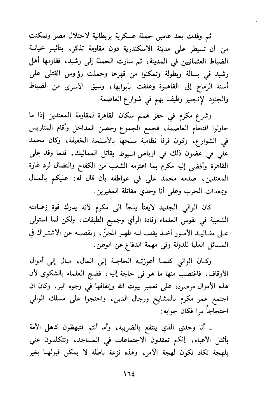 وكان الوالي كلما أعوزته الحاجة إلى المال، مال إلى أموال الأوقاف، فاغتصب منها ما هو في حاجة إليه، فضج العلماء بالشكوى لأن هذه الأموال مرصودة على تعمير بيوت اللّه وإنفاقها في وجوه البر، وكان ان اجتمع عمر مكرم بالمشايخ ورجال الدين، واحتجوا على مسلك الوالي احتجاجا مرا فكان جوابه: