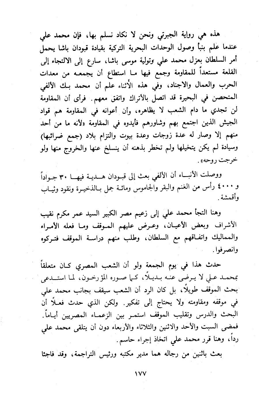هذه هي رواية الجبرتي ونحن لا نكاد نسلم بها، فإن محمد علي عندما علم بنبأ وصول الوحدات البحرية التركية بقيادة قبودان باشا يحمل أمر السلطان بعزل محمد علي وتولية موسى باشا، سارع إلى الالتجاء إلى القلعة مستعدا للمقاومة وجمع فيها ما استطاع أن يجمعه من معدات الحرب والعمال والاجناد، وفي هذه الأثناء علم أن محمد بك الألفي المتحصن في البحيرة قد اتصل بالأتراك واتفق معهم. فرأى أن المقاومة لن تجدي ما دام الشعب لا يظاهره، وأن أعوانه في المقاومة هم قواد الجيش الذين اجتمع بهم وشاورهم فأيدوه في المقاومة «لأنه ما من أحد منهم إلا وصار له عدة زوجات وعدة بيوت والتزام بلاد (جمع ضرائبها) وسيادة لم يكن يتخيلها ولم تخطر بذهنه أن ينسلخ عنها والخروج منها ولو خرجت روحه».
