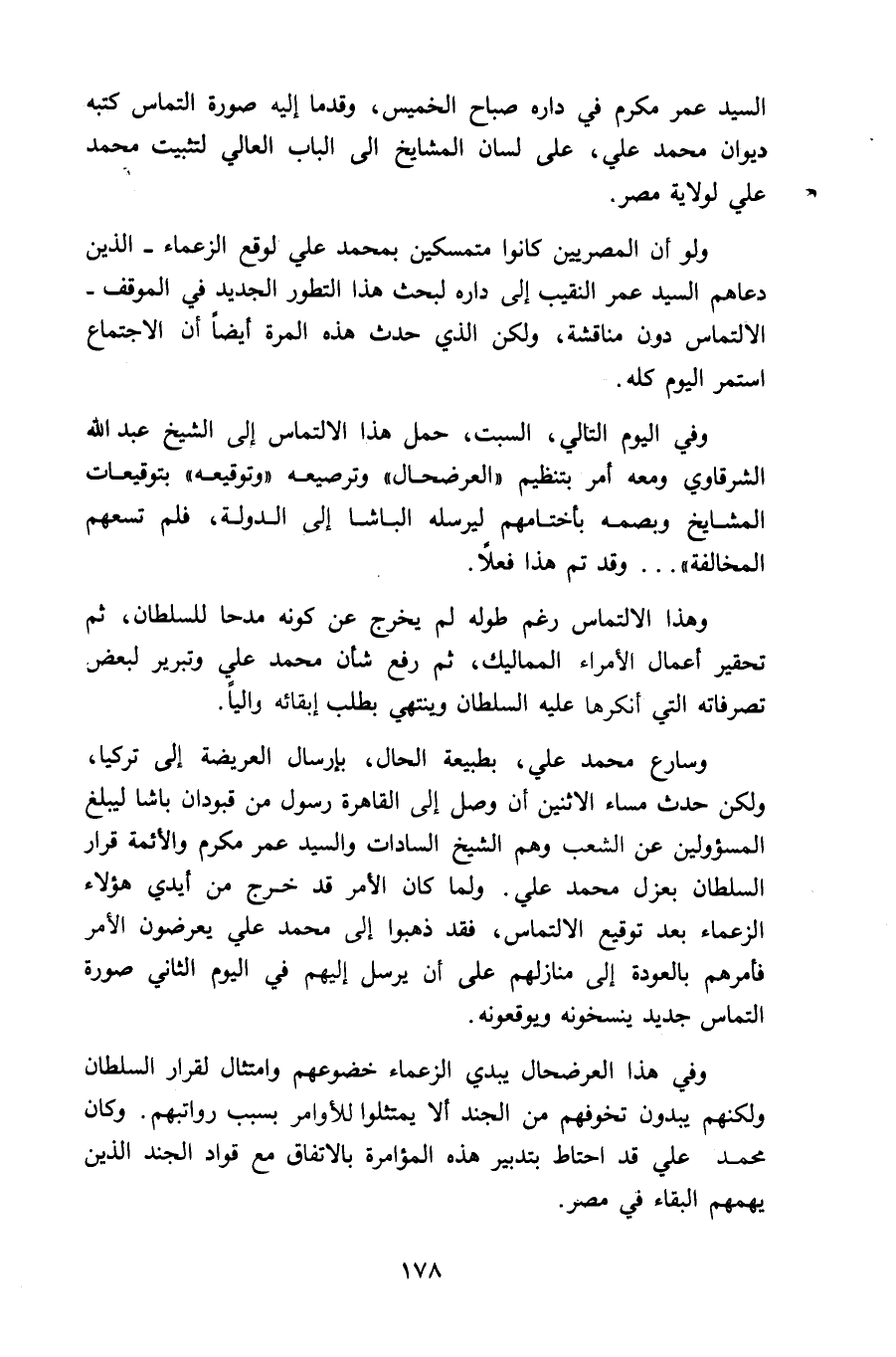 ولو أن المصريين كانوا متمسكين بمحمد علي لوقع الزعماء-الذين دعاهم السيد عمر النقيب إلى داره لبحث هذا التطور الجديد في الموقف- الالتماس دون مناقشة، ولكن الذي حدث هذه المرة أيضا أن الاجتماع استمر اليوم كله.