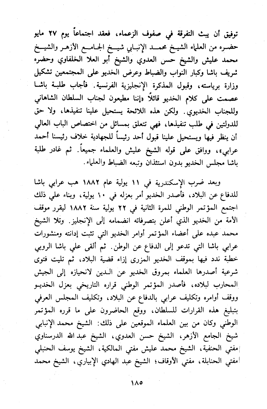 توفيق أن يبث التفرقة في صفوف الزعماء، فعقد اجتماعا يوم 27 مايو حضره من العلماء الشيخ محمد الإنبابي شيخ الجامع الأزهر والشيخ محمد عليش والشيخ حسن العدوي والشيخ أبو العلا الخلفاوي وحضره شريف باشا وكبار النواب والضباط وعرض الخديو على المجتمعين تشكيل وزارة برياسته، وقبول المذكرة الإنجليزية الفرنسية. فأجاب طلبة باشا عصمت على كلام الخديو قائلا «إننا مطيعون لجناب السلطان الشاهاني وللجناب الخديوي. ولكن هذه اللائحة يستحيل علينا تنفيذها، ولا حق للدولتين في طلب تنفيذها، فهي تتعلق بمسائل من اختصاص الباب العالي أن ينظر فيها ويستحيل علينا قبول أحد رئيسا للجهادية خلاف رئيسنا أحمد عرابي»، ووافق على قوله الشيخ عليش والعلماء جميعا. ثم غادر طلبة باشا مجلس الخديو بدون استئذان وتبعه الضباط والعلماء.