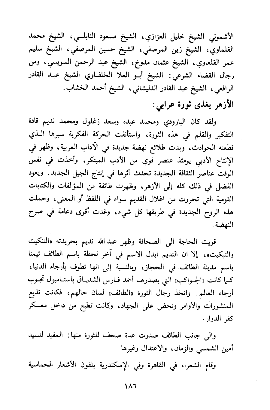 ولقد كان البارودي ومحمد عبده وسعد زغلول ومحمد نديم قادة التفكير والقلم في هذه الثورة، واستأنفت الحركة الفكرية سيرها الذي قطعته الحوادث، وبدت طلائع نهضة جديدة في الآداب العربية، وظهر في الإنتاج الأدبي يومئذ عنصر قوي من الأدب المبتكر، وأخذت في نفس الوقت عناصر الثقافة الجديدة تحدث أثرها في إنتاج الجيل الجديد. ويعود الفضل في ذلك كله إلى الأزهر، وظهرت طائفة من المؤلفات والكتابات القومية التي تحررت من اغلال القديم سواء في اللفظ أو المعنى، وحملت هذه الروح الجديدة في طريقها كل شيء، وغدت أقوى دعامة في صرح النهضة.