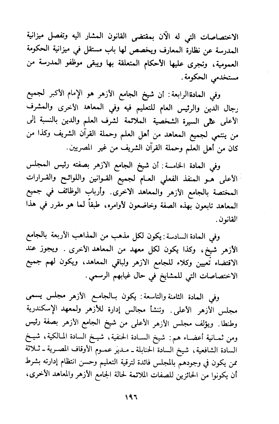 وفي المادة الثامنة والتاسعة: يكون بالجامع الأزهر مجلس يسمى مجلس الأزهر الأعلى. وتنشأ مجالس إدارة للأزهر ولمعهد الإسكندرية وطنطا. ويؤلف مجلس الأزهر الأعلى من شيخ الجامع الأزهر بصفة رئيس ومن ثمانية أعضاءهم: شيخ السادة الحنفية، شيخ السادة المالكية، شيخ السادة الشافعية، شيخ السادة الحنابلة-مدير عموم الأوقاف المصرية-ثلاثة ممن يكون في وجودهم بالمجلس فائدة لترقية التعليم وحسن انتظام إدارته بشرط أن يكونوا من الحائزين للصفات الملائمة لحالة الجامع الأزهر والمعاهد الأخرى،