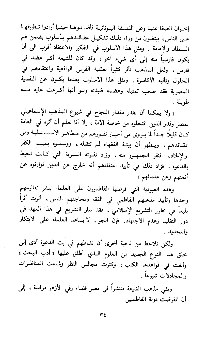 إخوان الصفا عنها وعن الفلسفة اليونانية فأفسدوها حينما أرادوا تطبيقها على الناس، يبتغون من وراء ذلك تشكيل عقائدهم بأسلوب يضمن لهم السلطان والإمامة. ومثل هذا الأسلوب في التفكير والاعتقاد أقرب الى أن يكون فارسيا منه إلى أي شيء آخر، وقد كان للشيعة أكبر عضد في فارس، ولعل المذهب تأثر كثيرا بعقلية الفرس الواقعية واعتقادهم في الحلول وتأليه الأكاسرة. ومثل هذا الأسلوب بعدما يكون عن النفسية المصرية فقد صعب تمثيله وهضمه فنبذته ولو أنها أكرهت عليه مدة طويلة.