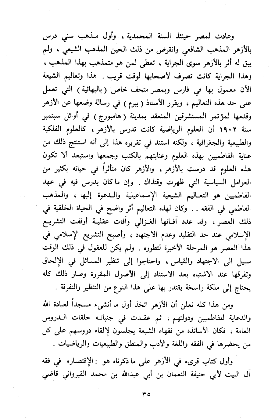وأول كتاب قرىء في الأزهر على ما ذكرناه هو «الإقتصار» في فقه آل البيت لأبي حنيفة النعمان بن أبي عبد اللّه بن محمد القيرواني قاضي
