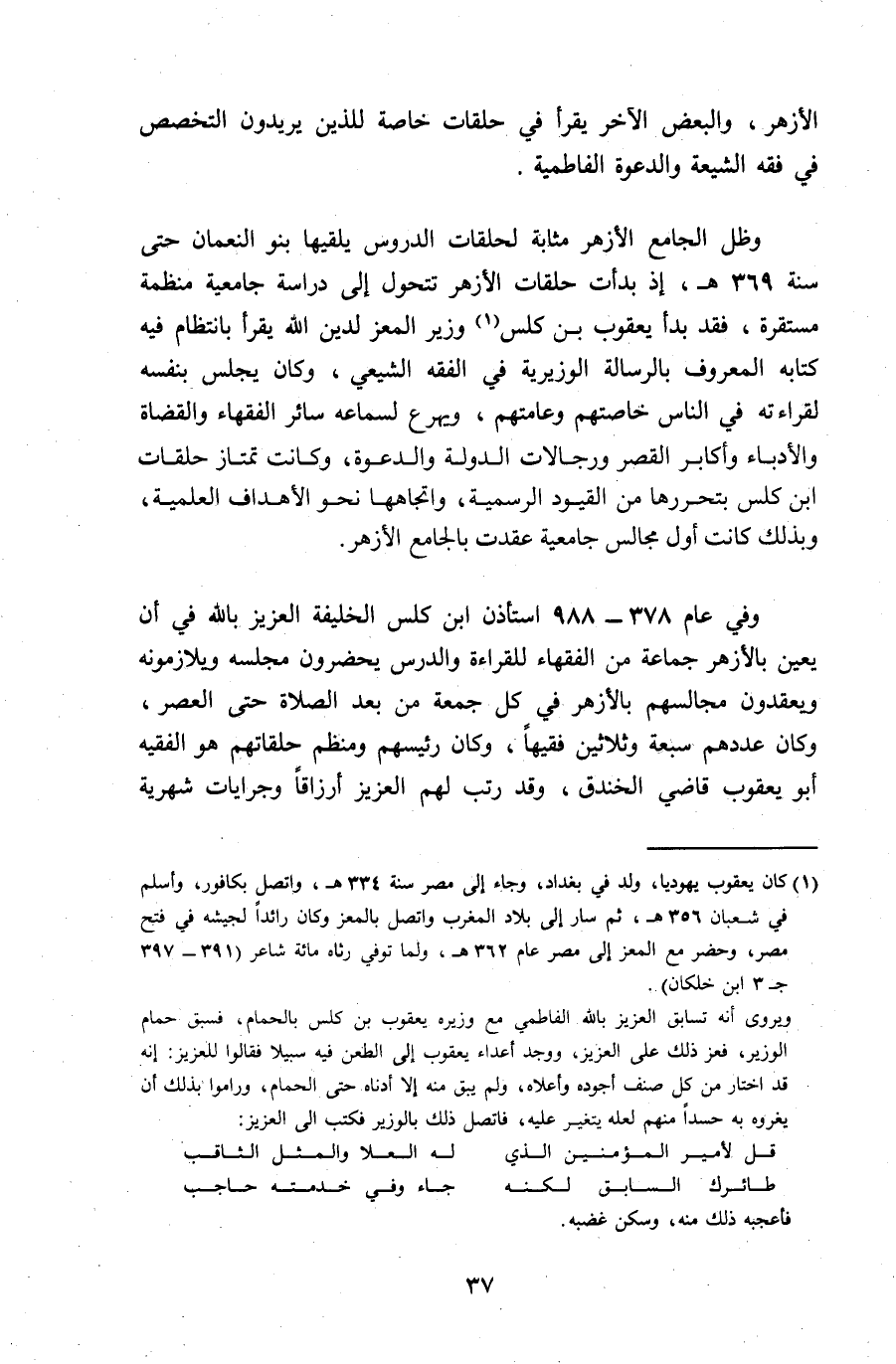 وظل الجامع الأزهر مثابة لحلقات الدروس يلقيها بنو النعمان حتى سنة 369 ه، إذ بدأت حلقات الأزهر تتحول إلى دراسة جامعية منظمة مستقرة، فقد بدأ يعقوب بن كلس 1 وزير المعز لدين اللّه يقرأ بانتظام فيه كتابه المعروف بالرسالة الوزيرية في الفقه الشيعي، وكان يجلس بنفسه لقراءته في الناس خاصتهم وعامتهم، ويهرع لسماعه سائر الفقهاء والقضاة والأدباء وأكابر القصر ورجالات الدولة والدعوة، وكانت تمتاز حلقات ابن كلس بتحررها من القيود الرسمية، واتجاهها نحو الأهداف العلمية، وبذلك كانت أول مجالس جامعية عقدت بالجامع الأزهر.