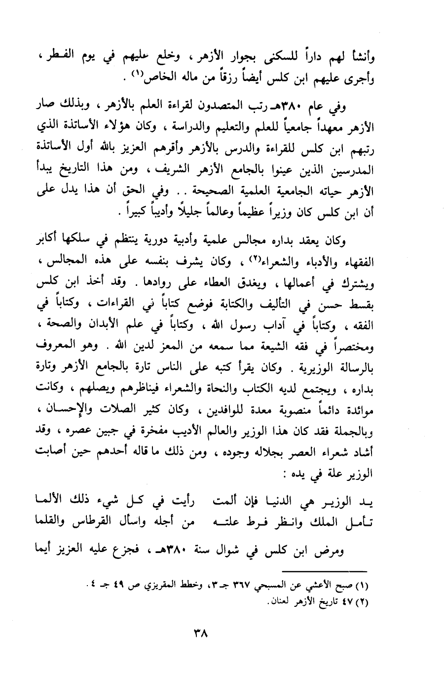 وفي عام 380 ه رتب المتصدون لقراءة العلم بالأزهر، وبذلك صار الأزهر معهدا جامعيا للعلم والتعليم والدراسة، وكان هؤلاء الأساتذة الذي رتبهم ابن كلس للقراءة والدرس بالأزهر وأقرهم العزيز باللّه أول الأساتذة المدرسين الذين عينوا بالجامع الأزهر الشريف، ومن هذا التاريخ يبدأ الأزهر حياته الجامعية العلمية الصحيحة. . وفي الحق أن هذا يدل على أن ابن كلس كان وزيرا عظيما وعالما جليلا وأديبا كبيرا.