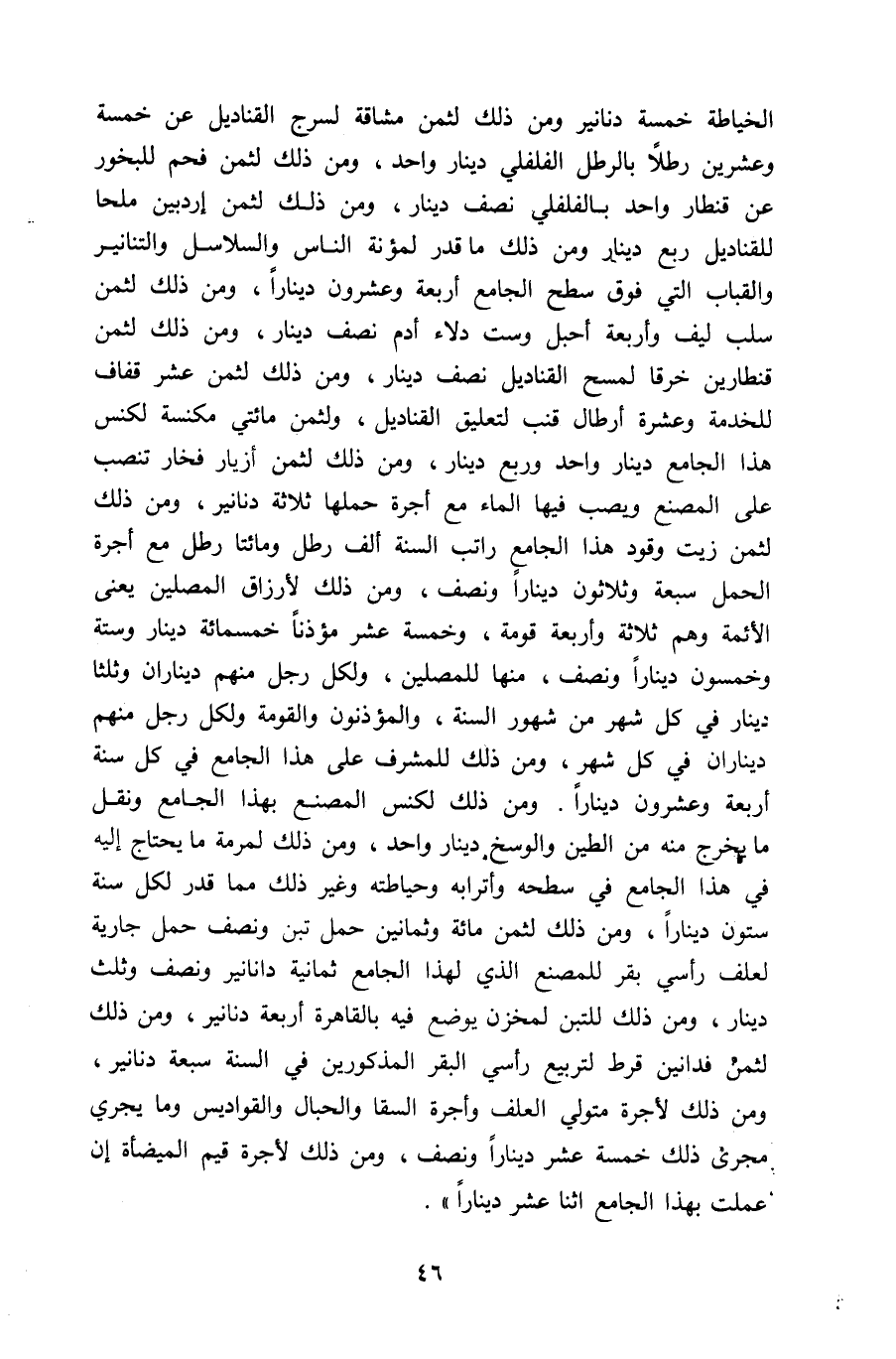 الخياطة خمسة دنانير ومن ذلك لثمن مشاقة لسرج القناديل عن خمسة وعشرين رطلا بالرطل الفلفلي دينار واحد، ومن ذلك لثمن فحم للبخور عن قنطار واحد بالفلفلي نصف دينار، ومن ذلك لثمن إردبين ملحا للقناديل ربع دينار ومن ذلك ما قدر لمؤنة الناس والسلاسل والتنانير والقباب التي فوق سطح الجامع أربعة وعشرون دينارا، ومن ذلك لثمن سلب ليف وأربعة أحبل وست دلاء أدم نصف دينار، ومن ذلك لثمن قنطارين خرقا لمسح القناديل نصف دينار، ومن ذلك لثمن عشر قفاف للخدمة وعشرة أرطال قنب لتعليق القناديل، ولثمن مائتي مكنسة لكنس هذا الجامع دينار واحد وربع دينار، ومن ذلك لثمن أزيار فخار تنصب على المصنع ويصب فيها الماء مع أجرة حملها ثلاثة دنانير، ومن ذلك لثمن زيت وقود هذا الجامع راتب السنة ألف رطل ومائتا رطل مع أجرة الحمل سبعة وثلاثون دينارا ونصف، ومن ذلك لأرزاق المصلين يعنى الأئمة وهم ثلاثة وأربعة قومة، وخمسة عشر مؤذنا خمسمائة دينار وستة وخمسون دينارا ونصف، منها للمصلين، ولكل رجل منهم ديناران وثلثا دينار في كل شهر من شهور السنة، والمؤذنون والقومة ولكل رجل منهم ديناران في كل شهر، ومن ذلك للمشرف على هذا الجامع في كل سنة أربعة وعشرون دينارا. ومن ذلك لكنس المصنع بهذا الجامع ونقل ما يخرج منه من الطين والوسخ دينار واحد، ومن ذلك لمرمة ما يحتاج إليه في هذا الجامع في سطحه وأترابه وحياطته وغير ذلك مما قدر لكل سنة ستون دينارا، ومن ذلك لثمن مائة وثمانين حمل تبن ونصف حمل جارية لعلف رأسي بقر للمصنع الذي لهذا الجامع ثمانية دانانير ونصف وثلث دينار، ومن ذلك للتبن لمخزن يوضع فيه بالقاهرة أربعة دنانير، ومن ذلك لثمن فدانين قرط لتربيع رأسي البقر المذكورين في السنة سبعة دنانير، ومن ذلك لأجرة متولي العلف وأجرة السقا والحبال والقواديس وما يجري مجرى ذلك خمسة عشر دينارا ونصف، ومن ذلك لأجرة قيم الميضأة إن عملت بهذا الجامع اثنا عشر دينارا».