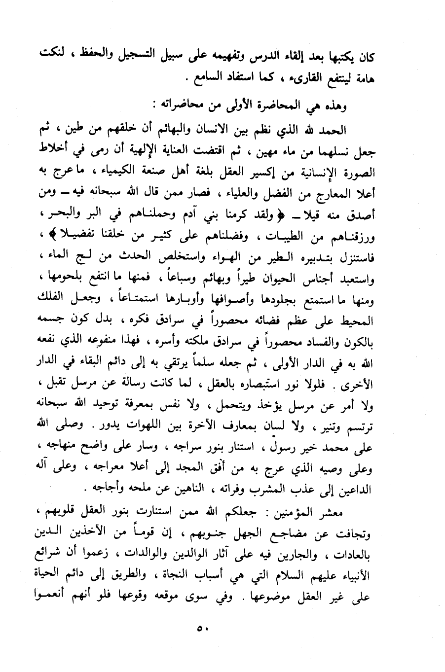 معشر المؤمنين: جعلكم اللّه ممن استنارت بنور العقل قلوبهم، وتجافت عن مضاجع الجهل جنوبهم، إن قوما من الآخذين الدين بالعادات، والجارين فيه على آثار الوالدين والوالدات، زعموا أن شرائع الأنبياء عليهم السلام التي هي أسباب النجاة، والطريق إلى دائم الحياة على غير العقل موضوعها. وفي سوى موقعه وقوعها فلو أنهم أنعموا