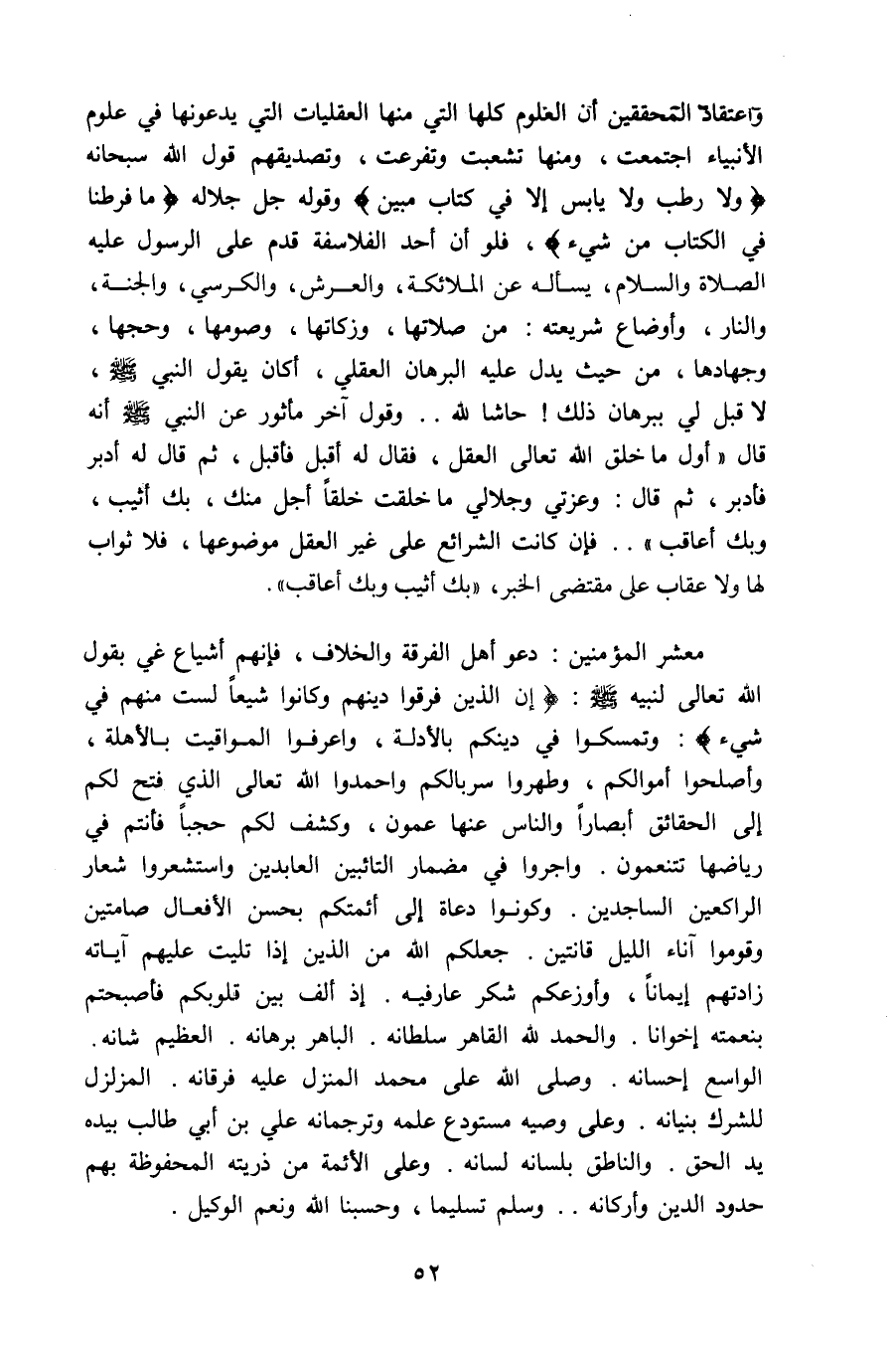 واعتقاد المحققين أن العلوم كلها التي منها العقليات التي يدعونها في علوم الأنبياء اجتمعت، ومنها تشعبت وتفرعت، وتصديقهم قول اللّه سبحانه وَلا رَطْبٍ وَلا يابِسٍ إِلاّ فِي كِتابٍ مُبِينٍ وقوله جل جلاله ما فَرَّطْنا فِي اَلْكِتابِ مِنْ شَيْءٍ، فلو أن أحد الفلاسفة قدم على الرسول عليه الصلاة والسلام، يسأله عن الملائكة، والعرش، والكرسي، والجنة، والنار، وأوضاع شريعته: من صلاتها، وزكاتها، وصومها، وحجها، وجهادها، من حيث يدل عليه البرهان العقلي، أكان يقول النبي صلى اللّه عليه وسلّم، لا قبل لي ببرهان ذلك! حاشا للّه. . وقول آخر مأثور عن النبي صلى اللّه عليه وسلّم أنه قال «أول ما خلق اللّه تعالى العقل، فقال له أقبل فأقبل، ثم قال له أدبر فأدبر، ثم قال: وعزتي وجلالي ما خلقت خلقا أجل منك، بك أثيب، وبك أعاقب». . فإن كانت الشرائع على غير العقل موضوعها، فلا ثواب لها ولا عقاب على مقتضى الخبر، «بك أثيب وبك أعاقب».