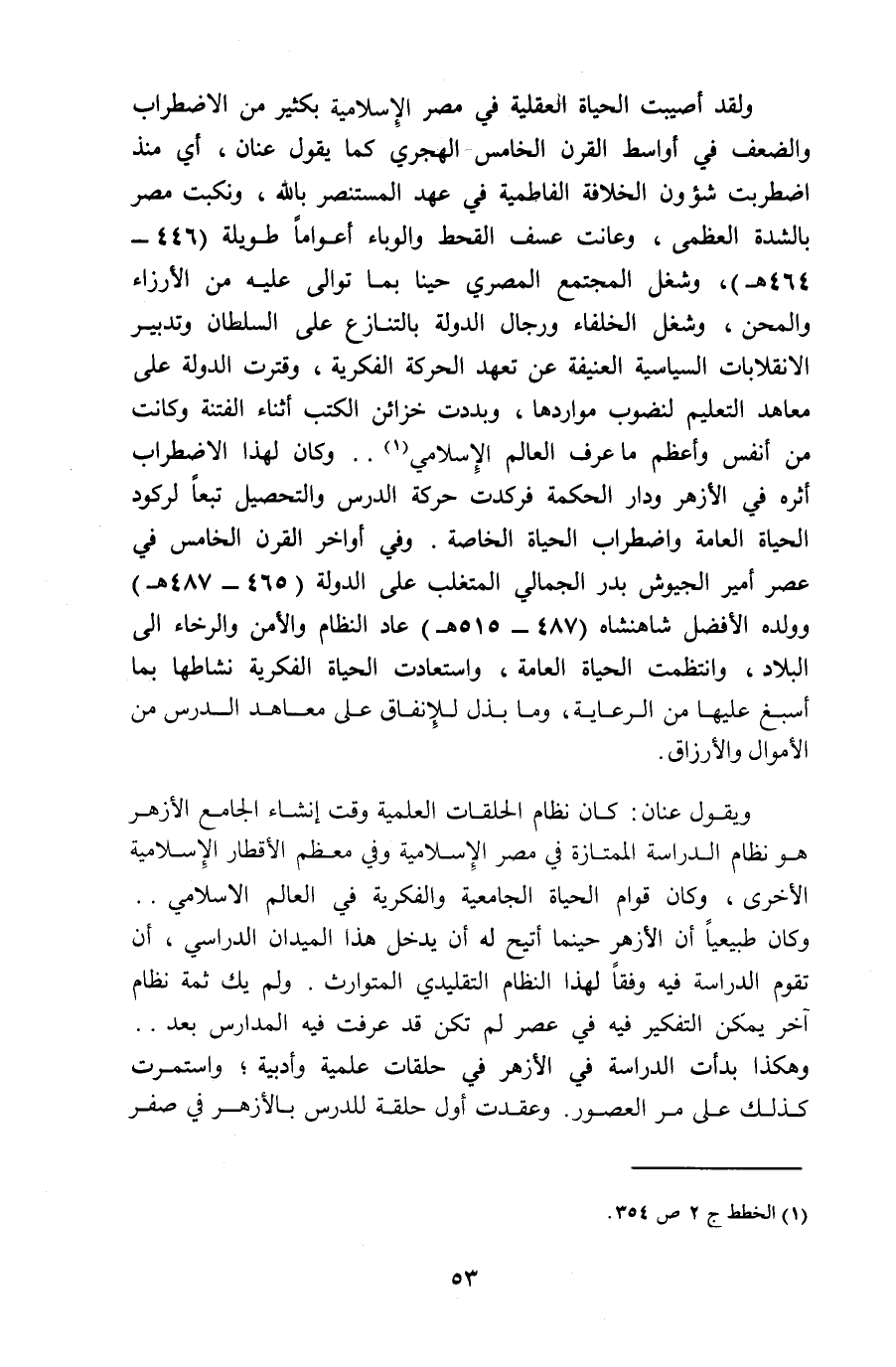 ويقول عنان: كان نظام الحلقات العلمية وقت إنشاء الجامع الأزهر هو نظام الدراسة الممتازة في مصر الإسلامية وفي معظم الأقطار الإسلامية الأخرى، وكان قوام الحياة الجامعية والفكرية في العالم الاسلامي. .