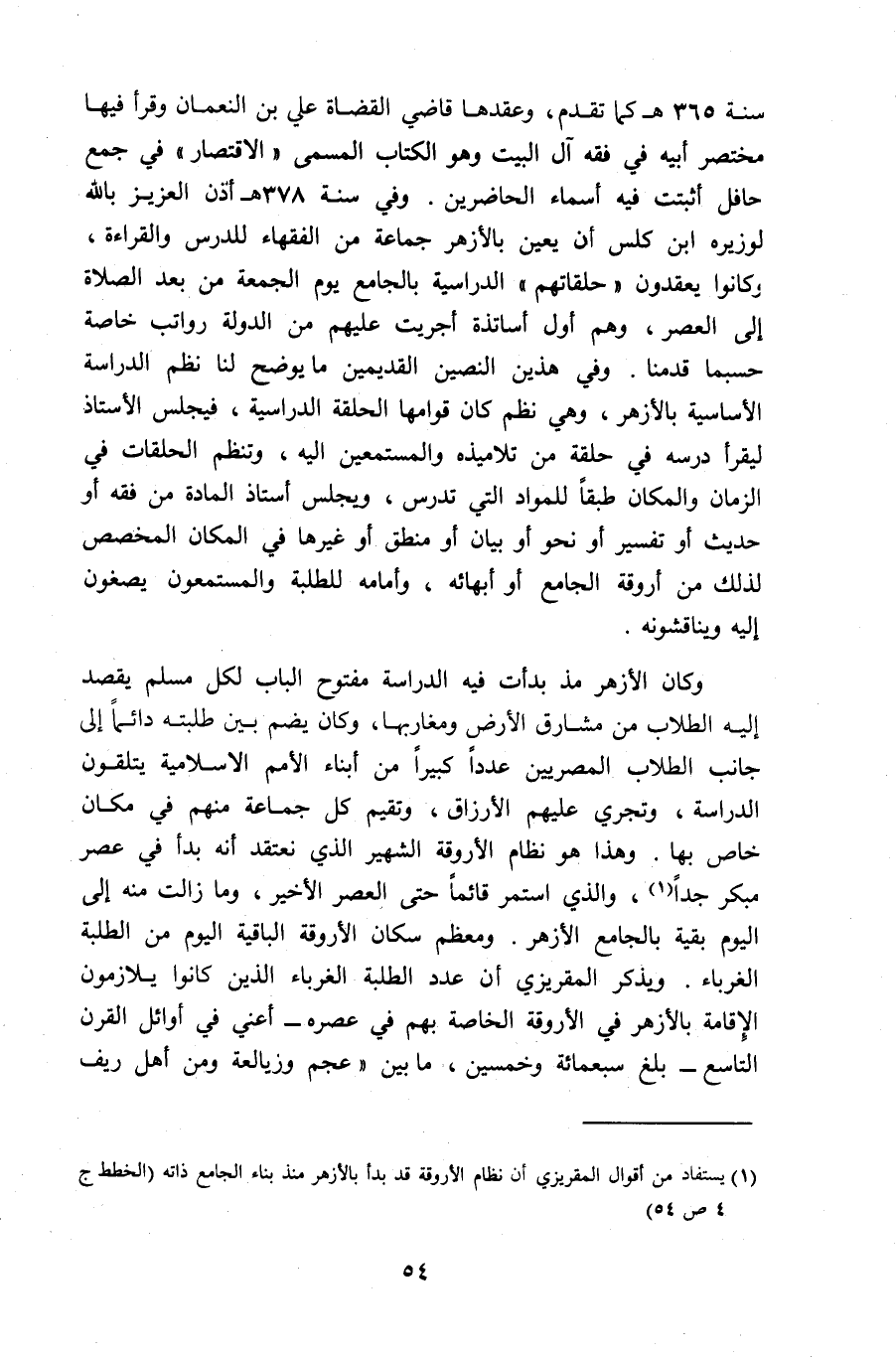 سنة 365 ه كما تقدم، وعقدها قاضي القضاة علي بن النعمان وقرأ فيها مختصر أبيه في فقه آل البيت وهو الكتاب المسمى «الاقتصار» في جمع حافل أثبتت فيه أسماء الحاضرين. وفي سنة 378 ه أذن العزيز باللّه لوزيره ابن كلس أن يعين بالأزهر جماعة من الفقهاء للدرس والقراءة، وكانوا يعقدون «حلقاتهم» الدراسية بالجامع يوم الجمعة من بعد الصلاة إلى العصر، وهم أول أساتذة أجريت عليهم من الدولة رواتب خاصة حسبما قدمنا. وفي هذين النصين القديمين ما يوضح لنا نظم الدراسة الأساسية بالأزهر، وهي نظم كان قوامها الحلقة الدراسية، فيجلس الأستاذ ليقرأ درسه في حلقة من تلاميذه والمستمعين اليه، وتنظم الحلقات في الزمان والمكان طبقا للمواد التي تدرس، ويجلس أستاذ المادة من فقه أو حديث أو تفسير أو نحو أو بيان أو منطق أو غيرها في المكان المخصص لذلك من أروقة الجامع أو أبهائه، وأمامه للطلبة والمستمعون يصغون إليه ويناقشونه.