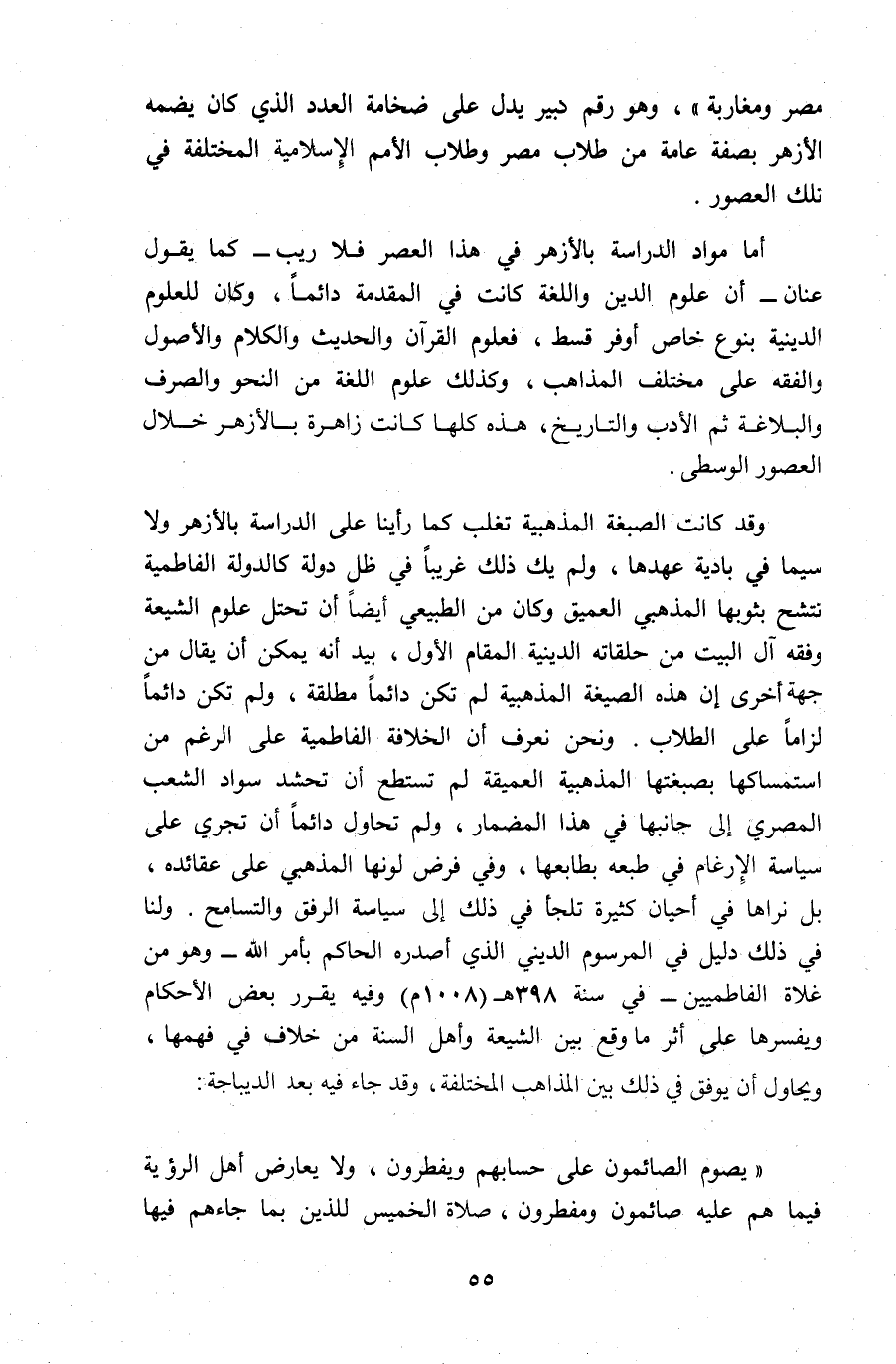 وقد كانت الصبغة المذهبية تغلب كما رأينا على الدراسة بالأزهر ولا سيما في بادية عهدها، ولم يك ذلك غريبا في ظل دولة كالدولة الفاطمية نتشح بثوبها المذهبي العميق وكان من الطبيعي أيضا أن تحتل علوم الشيعة وفقه آل البيت من حلقاته الدينية المقام الأول، بيد أنه يمكن أن يقال من جهة أخرى إن هذه الصيغة المذهبية لم تكن دائما مطلقة، ولم تكن دائما لزاما على الطلاب. ونحن نعرف أن الخلافة الفاطمية على الرغم من استمساكها بصبغتها المذهبية العميقة لم تستطع أن تحشد سواد الشعب المصري إلى جانبها في هذا المضمار، ولم تحاول دائما أن تجري على سياسة الإرغام في طبعه بطابعها، وفي فرض لونها المذهبي على عقائده، بل نراها في أحيان كثيرة تلجأ في ذلك إلى سياسة الرفق والتسامح. ولنا في ذلك دليل في المرسوم الديني الذي أصدره الحاكم بأمر اللّه-و هو من غلاة الفاطميين-في سنة 398 ه (1008 م) وفيه يقرر بعض الأحكام ويفسرها على أثر ما وقع بين الشيعة وأهل السنة من خلاف في فهمها، ويحاول أن يوفق في ذلك بين المذاهب المختلفة، وقد جاء فيه بعد الديباجة: