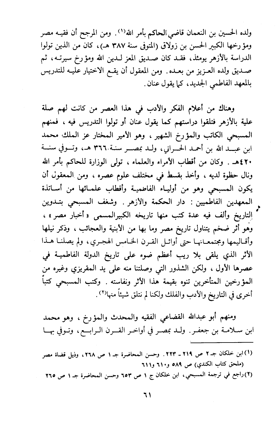 2) راجع في ترجمة المسبحي، ابن خلكان ج 1 ص 653 وحسن المحاضرة ج 1 ص 265