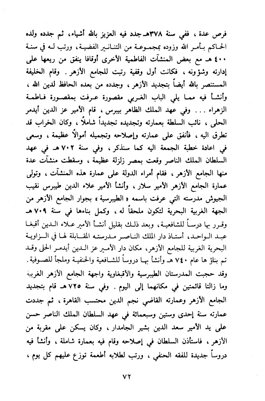 فرص عدة، ففي سنة 378 ه جدد فيه العزيز باللّه أشياء، ثم جدده ولده الحاكم بأمر اللّه وزوده بمجموعة من التنانير الفضية، ورتب له في سنة 400 ه مع بعض المنشآت الفاطمية الأخرى أوقافا ينفق من ريعها على إدارته وشؤونه، فكانت أول وقفية رتبت للجامع الأزهر. وقام الخليفة المستنصر باللّه أيضا بتجديد الأزهر، وجدده من بعده الحافظ لدين اللّه، وأنشأ فيه مما يلي الباب الغربي مقصورة عرفت بمقصورة فاطمة الزهراء. . . وفي عهد الملك الظاهر بيبرس، قام الأمير عز الدين أيدمر الحلى، نائب السلطة بعمارته وتجديده تجديدا شاملا، وكان الخراب قد تطرق اليه، فأنفق على عمارته وإصلاحه وتجميله أموالا عظيمة، وسعى في اعادة خطبة الجمعة اليه كما سنذكر، وفي سنة 702 ه في عهد السلطان الملك الناصر وقعت بمصر زلزلة عظيمة، وسقطت منشآت عدة منها الجامع الأزهر، فقام أمراء الدولة على عمارة هذه المنشآت، وتولى عمارة الجامع الأزهر الأمير سلار، وأنشأ الأمير علاء الدين طيبرس نقيب الجيوش مدرسته التي عرفت باسمه «الطيبرسية» بجوار الجامع الأزهر من الجهة الغربية البحرية لتكون ملحقا له، وكمل بناءها في سنة 709 ه وقرر بها درسا للشافعية، وبعد ذلك بقليل أنشأ الأمير علاء الدين أقبغا عبد الواحد، أستاذ دار الملك الناصر مدرسته المقابلة لها في الزاوية البحرية الغربية للجامع الأزهر، مكان دار الأمير عز الدين أيدمر الحلى وقد تم بناؤها عام 740 ه وأنشأ بها دروسا للشافعية والحنفية وملجأ للصوفية.