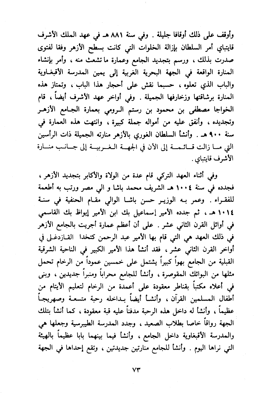 وأوقف على ذلك أوقافا جليلة. وفي سنة 881 ه في عهد الملك الأشرف قايتباي أمر السلطان بإزالة الخلوات التي كانت بسطح الأزهر وفقا لفتوى صدرت بذلك، ورسم بتجديد الجامع وعمارة ما تشعث منه، وأمر بإنشاء المنارة الواقعة في الجهة البحرية الغربية إلى يمين المدرسة الأقبغاوية والباب الذي تعلوه، حسبما نقش على أحجار هذا الباب، وتمتاز هذه المنارة برشاقتها وزخارفها الجميلة. وفي أواخر عهد الأشرف أيضا، قام الخواجا مصطفى بن محمود بن رستم الرومي بعمارة الجامع الأزهر وتجديده، وأنفق عليه من أمواله جملة كبيرة، وانتهت هذه العمارة في سنة 900 ه. وأنشأ السلطان الغوري بالأزهر منارته الجميلة ذات الرأسين التي ما زالت قائمة إلى الآن في الجهة الغربية إلى جانب منارة الأشرف قايتباي.