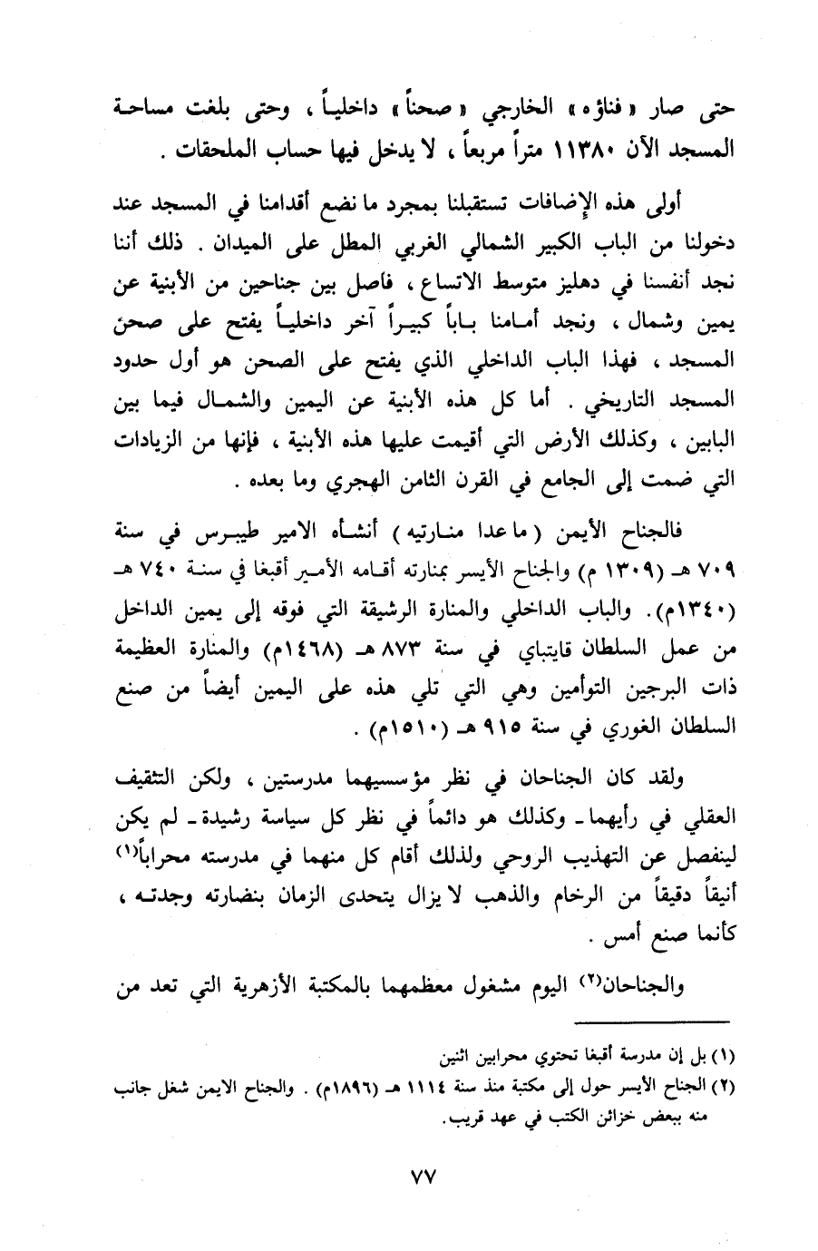 ولقد كان الجناحان في نظر مؤسسيهما مدرستين، ولكن التثقيف العقلي في رأيهما-و كذلك هو دائما في نظر كل سياسة رشيدة-لم يكن لينفصل عن التهذيب الروحي ولذلك أقام كل منهما في مدرسته محرابا 1 أنيقا دقيقا من الرخام والذهب لا يزال يتحدى الزمان بنضارته وجدته، كأنما صنع أمس.