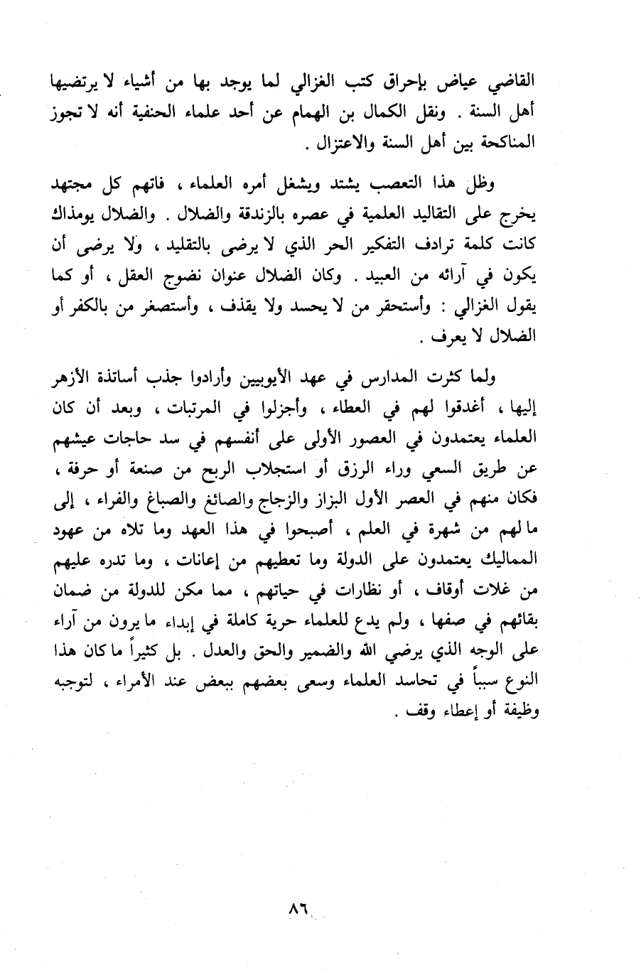 وظل هذا التعصب يشتد ويشغل أمره العلماء، فاتهم كل مجتهد يخرج على التقاليد العلمية في عصره بالزندقة والضلال. والضلال يومذاك كانت كلمة ترادف التفكير الحر الذي لا يرضى بالتقليد، ولا يرضى أن يكون في آرائه من العبيد. وكان الضلال عنوان نضوج العقل، أو كما يقول الغزالي: وأستحقر من لا يحسد ولا يقذف، وأستصغر من بالكفر أو الضلال لا يعرف.