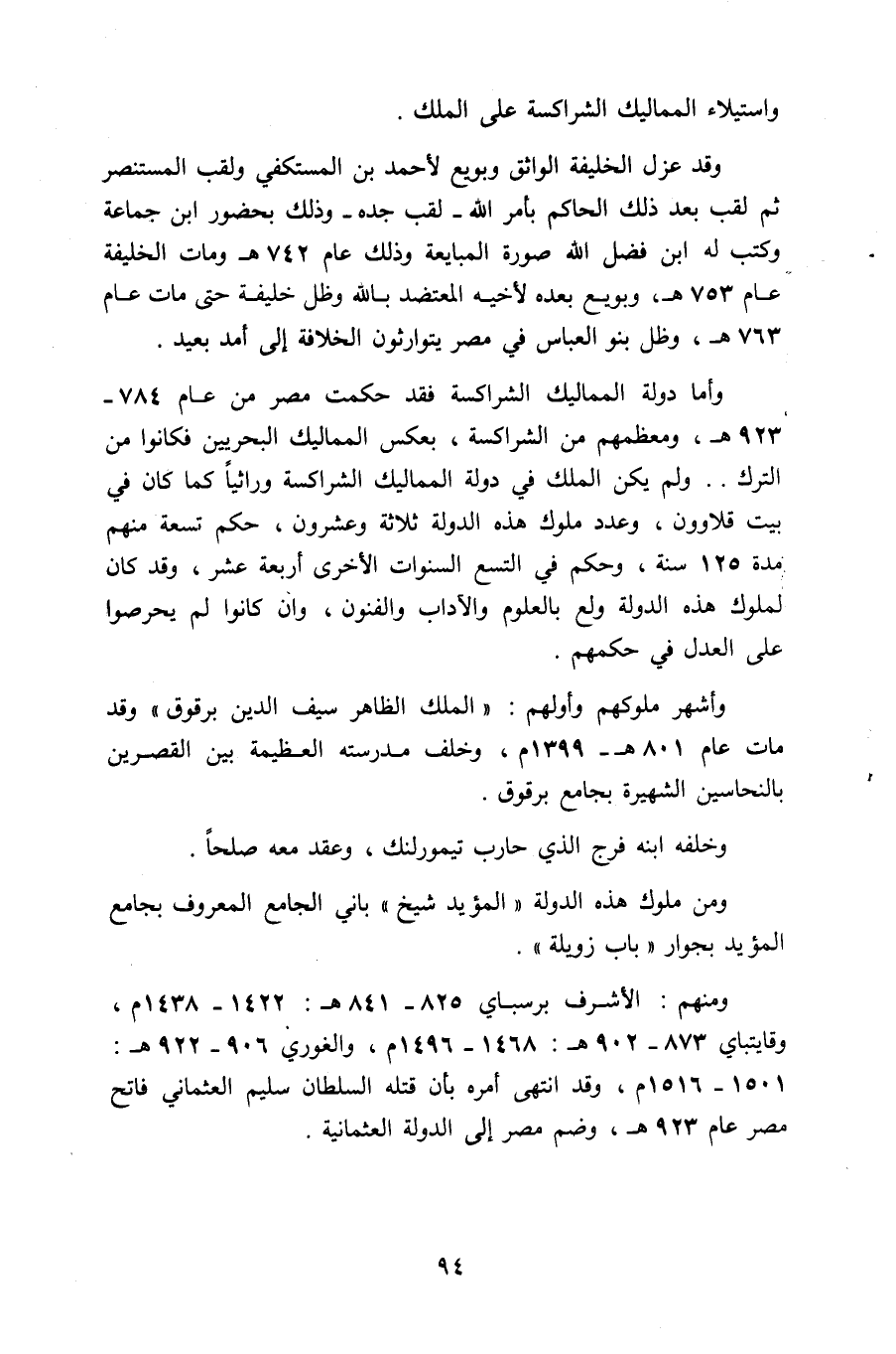 وأما دولة المماليك الشراكسة فقد حكمت مصر من عام 784 - 923 ه، ومعظمهم من الشراكسة، بعكس المماليك البحريين فكانوا من الترك. . ولم يكن الملك في دولة المماليك الشراكسة وراثيا كما كان في بيت قلاوون، وعدد ملوك هذه الدولة ثلاثة وعشرون، حكم تسعة منهم مدة 125 سنة، وحكم في التسع السنوات الأخرى أربعة عشر، وقد كان لملوك هذه الدولة ولع بالعلوم والآداب والفنون، وان كانوا لم يحرصوا على العدل في حكمهم.