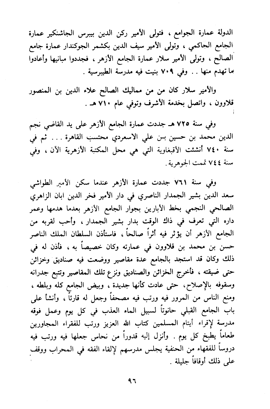 وفي سنة 725 ه جددت عمارة الجامع الأزهر على يد القاضي نجم الدين محمد بن حسين بن علي الاسعردي محتسب القاهرة. . . ثم في سنة 740 أنشئت الأقبغاوية التي هي محل المكتبة الأزهرية الآن، وفي سنة 744 تممت الجوهرية.