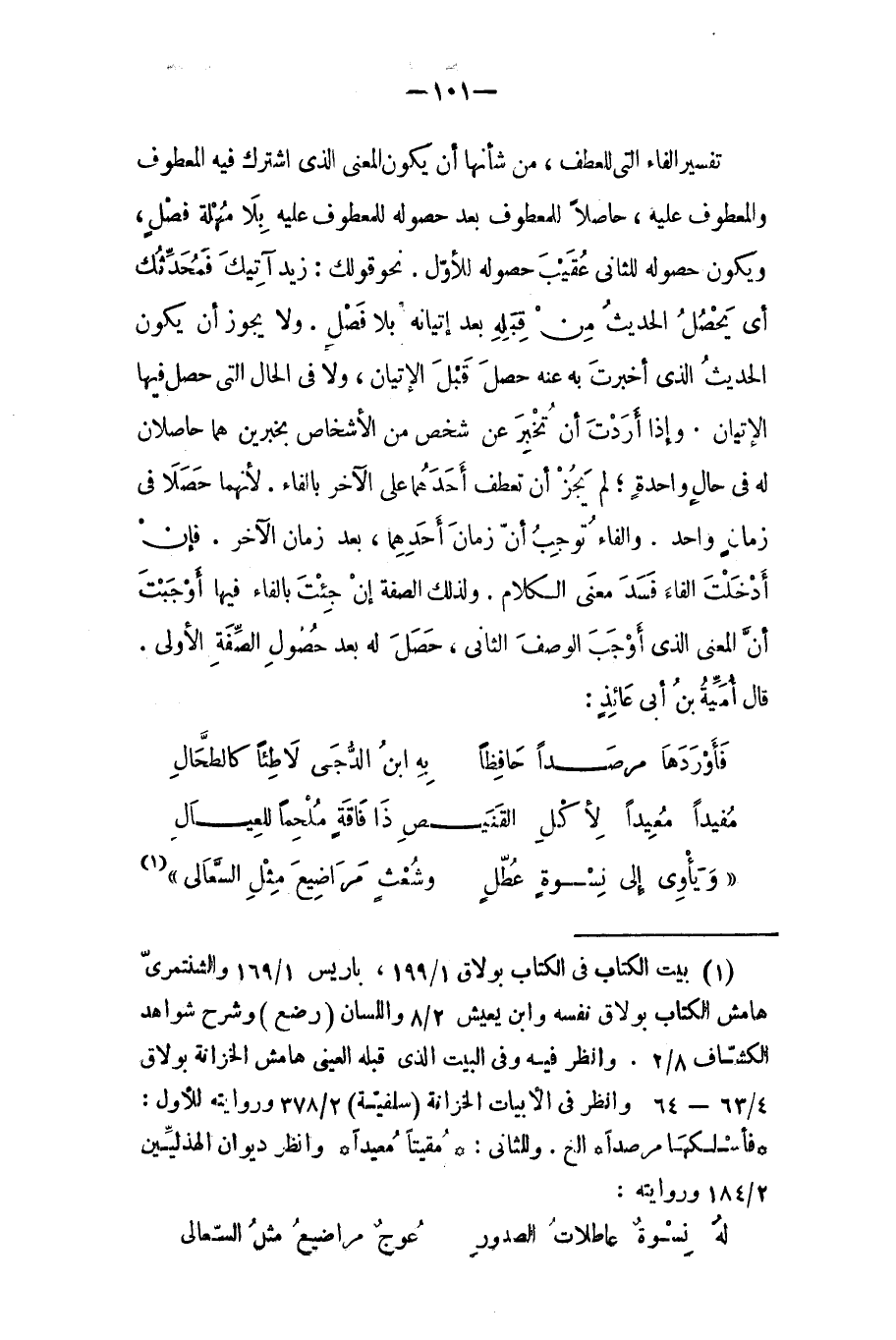 من شأنها أن يكون المعنى الذي اشترك فيه المعطوف والمعطوف عليه؛ حاصلا للمعطوف بعد حصوله للمعطوف عليه بلا مهلة فصل، ويكون حصوله للثاني عقب حصوله للأول. نحو قولك: زيد آتيك فمحدثك، أي يحصل الحديث من قبله بعد إتيانه بلا فصل.