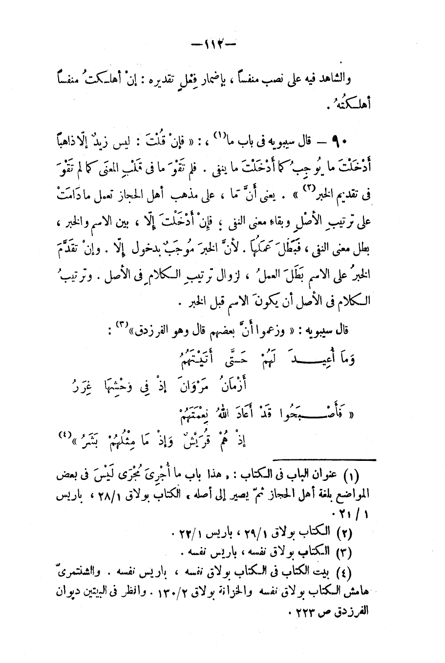 قال سيبويه في باب (ما): فإن قلت ليس زيد إلا ذاهبا، أدخلت ما يوجب كما أدخلت ما ينفي، فلم تقو (ما) في قلب المعنى، كما لم نقو في تقديم الخبر.