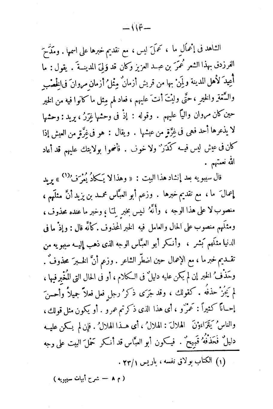 قال سيبويه بعد إنشاد هذا البيت: وهذا لا يكاد يعرف يريد: إعمال (ما) مع تقديم خبرها. وزعم أبو العباس محمد بن يزيد أن (مثلهم) منصوب لا على هذا الوجه، وانه ليس بخبر لـ (ما) وخبر (ما) عنده محذوف. و (مثلهم) منصوب على الحال، والعامل فيه الخبر المحذوف. كأنه قال: وإذ ما في الدنيا مثلهم بشر. وأنكر أبو العباس الوجه الذي ذهب إليه سيبويه من تقديم خبر (ما) مع الأعمال حين اضطر الشاعر، وزعم أن الخبر محذوف.