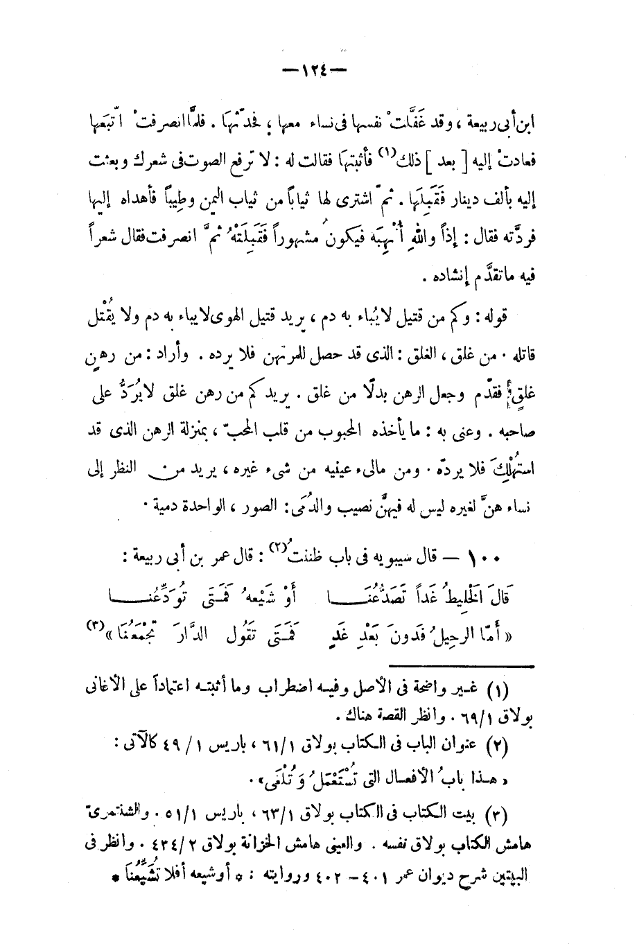 بن أبي ربيعة وقد غفلت نفسها في نساء معها، فحدثها، فلما انصرفت اتبعها، فعادت إليه بعد ذلك فأثبتها فقالت له: لا ترفع الصوت في شعرك، وبعثت إليه بألف دينار فقبلها، ثم اشترى لها ثيابا من ثياب اليمن وطيبا، فأهداه إليها، فردته، فقال: إذن والله انهبه فيكون مشهورا، فقبلته ثم انصرفت، فقال شعرا، فيه ما تقدم إنشاده.