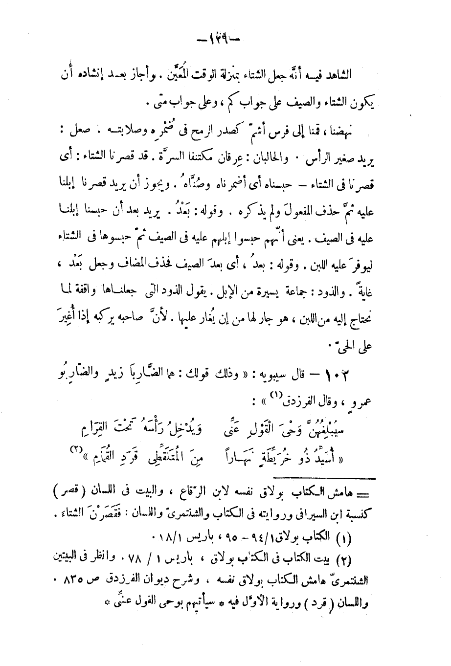الشاهد: في إنه جعل الشتاء بمنزلة الوقت المعين، وأجاز بعد إنشاده أن يكون الشتاء والصيف على جواب (كم) وعلى جواب (متى).