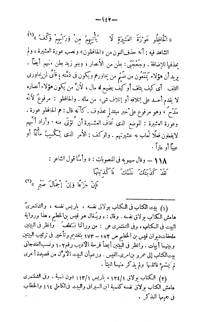 الشاهد فيه على إنه حذف النون من (الحافظون) ونصب (عورة العشيرة) ولم يحذفها للإضافة.