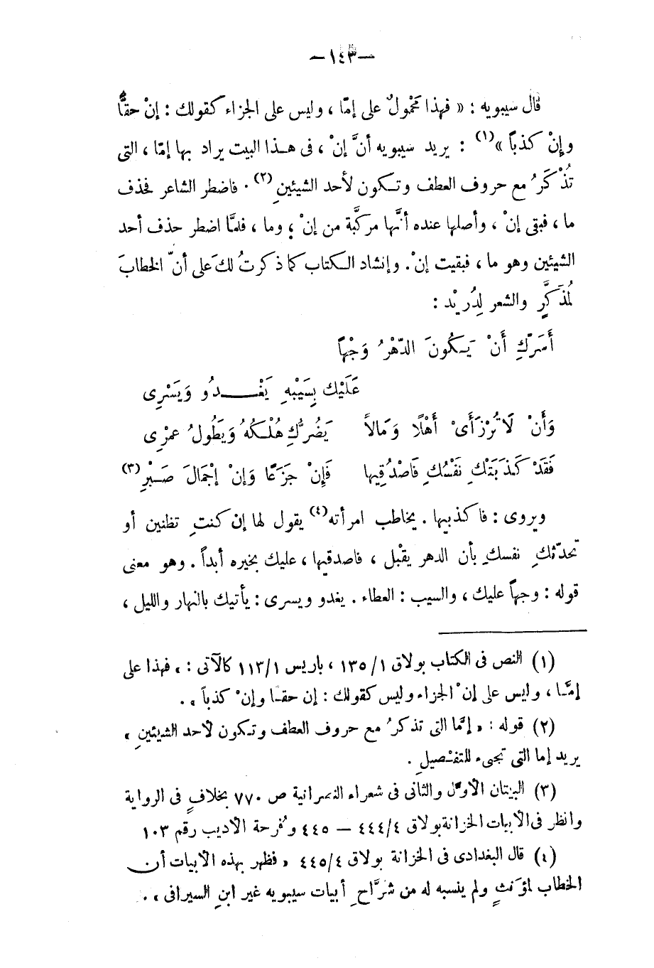 يريد سيبويه أن (إنْ) في هذا البيت يراد بها (إما) التي تذكر مع حروف العطف، وتكون لأحد الشيئين، فاضطر الشاعر فحذف (ما) فبقي (إنْ) وأصلها عنده أنها مركبة من: أن وما، فلما اضطر حذف أحد الشيئين وهو (ما) فبقيت (إن)