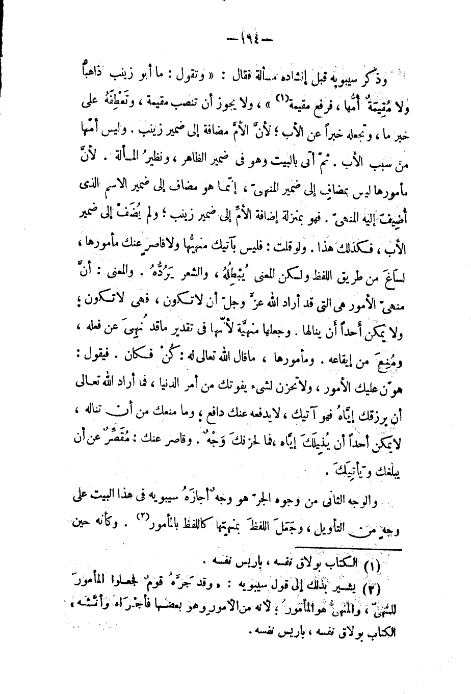 ثم أتى بالبيت، وهو في ضمير الظاهر، ونظير المسألة، لأن (مأمورها) ليس بمضاف إلى ضمير المنهي، إنما هو مضاف إلى ضمير الاسم الذي أضيف إليه (المنهي) فهو بمنزلة إضافة (الأم) إلى ضمير (زينب) ولم يضف إلى ضمير (الأب)، فكذلك هذا.