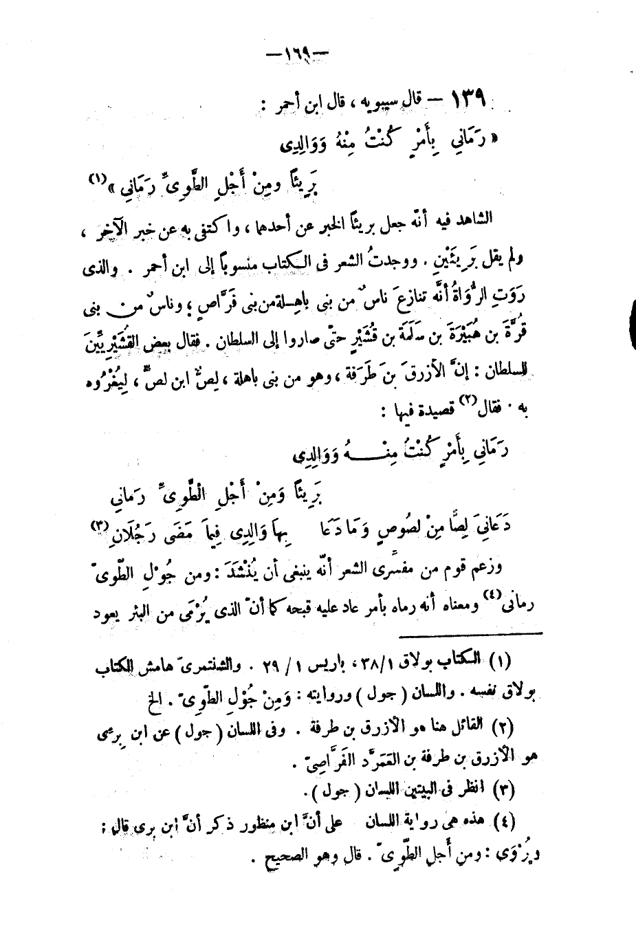 وزعم قوم من مفسري الشعر إنه ينبغي أن ينشد: ومن جول الطوى رماني. ومعناه إنه رماني بأمر عاد عليه قبيحه، كما أن الذي يرمى من البئر يعود