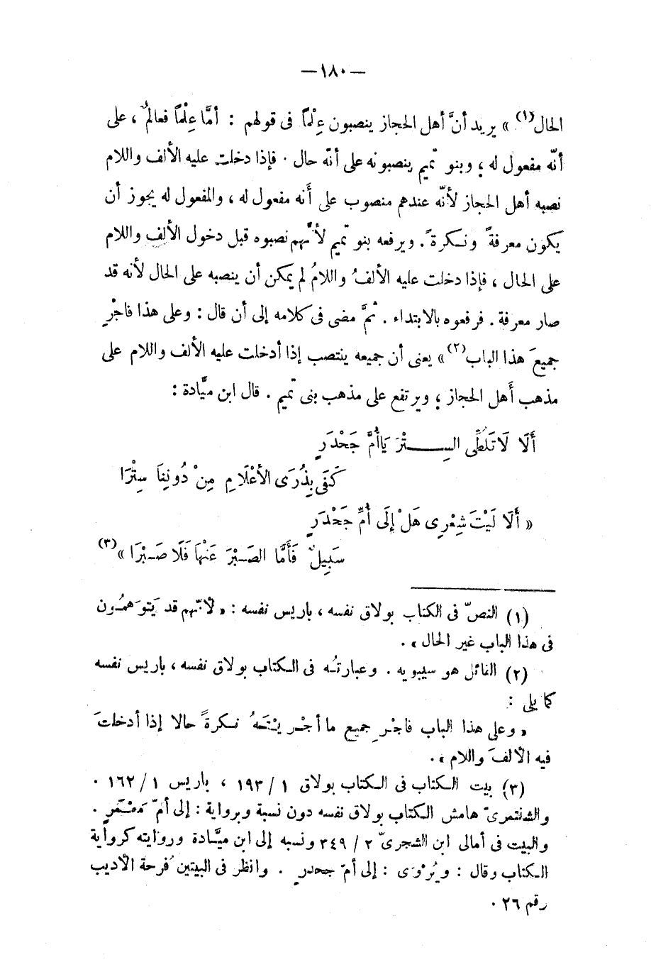 وبنو تميم ينصبونه عل إنه حال، فإذا دخلت عليه الألف واللام نصبه أهل الحجاز؛ لأنه عندهم منصوب على إنه مفعول له، والمفعول له يجوز أن يكون معرفة ونكرة. ويرفعه بنو تميم لأنهم نصبوه قبل دخول الألف واللام على الحال، فإذا دخلت عليه الألف واللام لم يمكنه أن ينصبه على الحال لأنه قد صار معرفة، فرفعوه بالابتداء. ثم مضى في كلامه إلى أن قال: وعلى هذا فأجر جميع هذا الباب. يعني أن جميعه ينتصب إذا دخلت عليه الألف واللام على مذهب أهل الحجاز، ويرتفع على مذهب بني تميم. قال ابن ميادة: