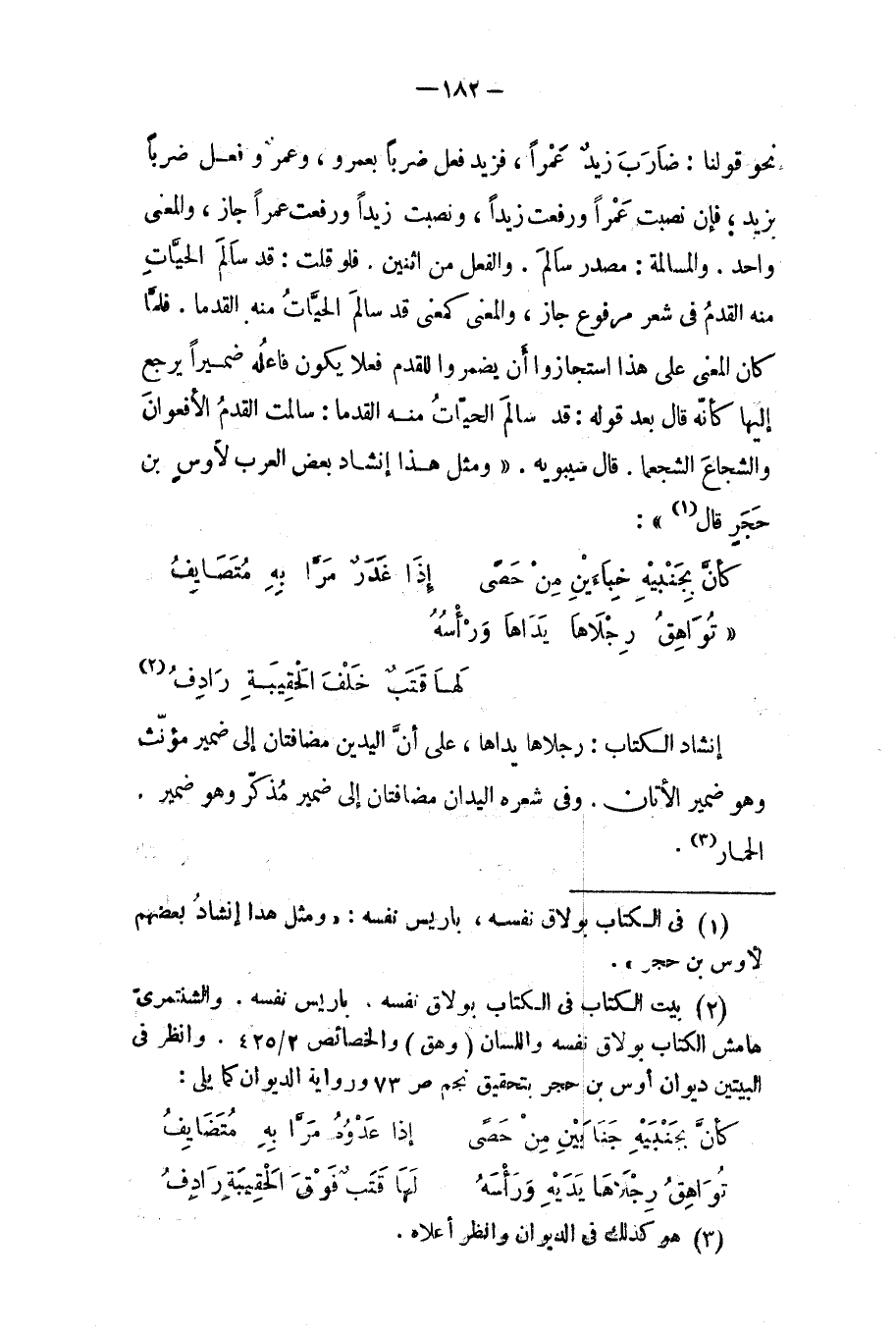 إنشاد الكتاب: رجلاها يداها، على أن اليدين مضافتان إلى ضمير مؤنث وهو ضمير الأتان، وفي شعره: اليدان مضافتان الى ضمير مذكر وهو ضمير الحمار.