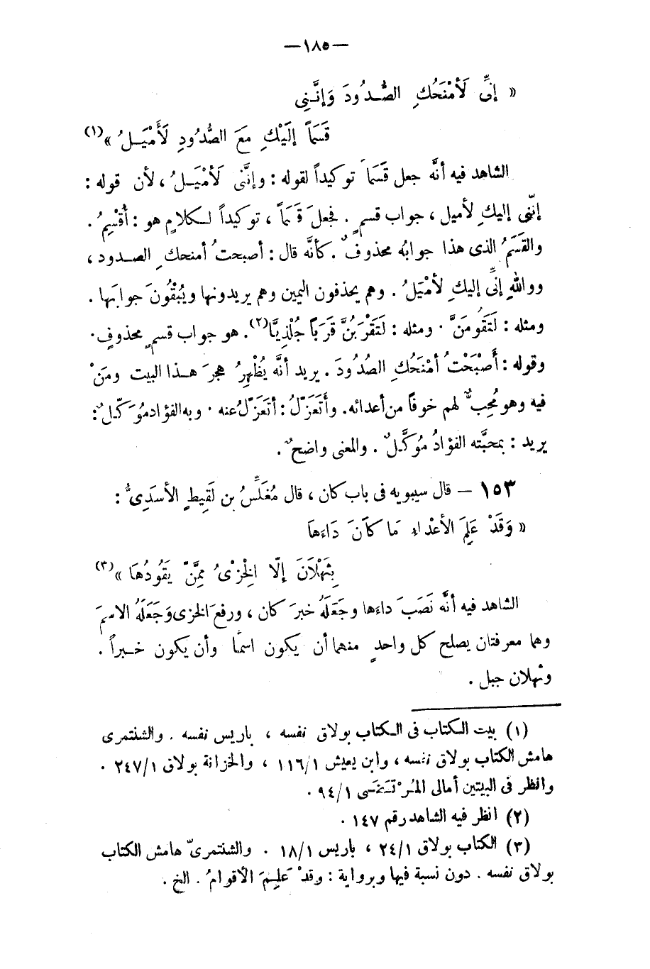 الشاهد فيه إنه جعل (قسما) تأكيدا لقوله: وإنني لأميل، لأن قوله: إنني إليك لأميل، جواب قسم، فجعل (قسما) توكيدا لكلام هو (أقسم)، والقسم الذي هذا جوابه محذوف، كأنه قال: أصبحت أمنحك الصدود، ووالله إني إليك لأميل. وهم يحذفون اليمين وهم يريدونها ويبقون جوابها، ومثله: لتقومن، ومثله: