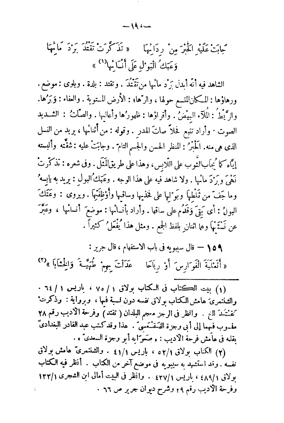 وتقتد: بلد، وبلوى: موضع، ورهاؤها: المكان المتسع حولها، والرهاء: الأرض المستوية، والعفاء: وبرها، والريط: الملاء البيض، وإقراؤها: ظهورها وأعاليها، والصات: الشديد الصوت. وأراد: تتبع فحلا صات الهدر. وقوله: من أثنائها، يريد: من النسل الذي هو منه، والحبر: المنظر الحسن والجسم التام وجابت عليه: شقته وألبسته إياه كما يجاب الثوب على اللابس، وهذا على طريق المثل.