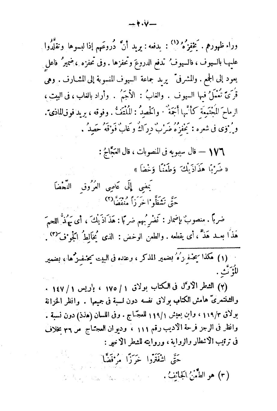 وفي (تحفزه) ضمير فاعل يعود إلى الجمع، والمشرفي: يريد جماعة السيوف المنسوبة إلى المشارف وهي قرى تعمل فيها السيوف، والغاب: الأجم، واراد بالغاب في البيت: الرماح المجتمعة كأنها أجمة، والحصد: الملتف، وفوقه: يريد فوق الماذي.
