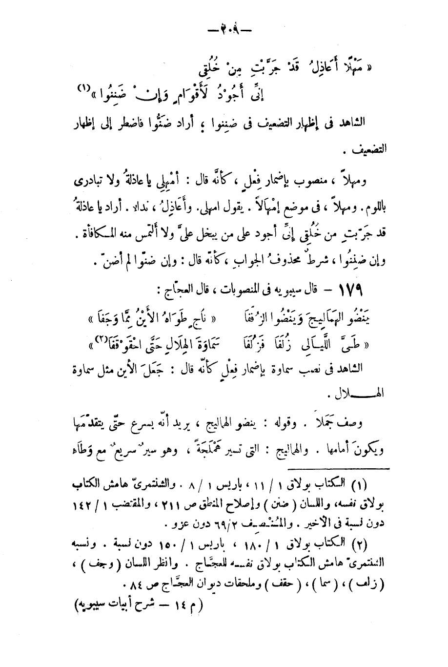 الشاهد في إظهار التضعيف في (ضننوا) أراد ضنوا فاضطر إلى إظهار التضعيف. و (مهلا) منصوب بإضمار فعل، كأنه قال: أمهلي يا عاذلة ولا