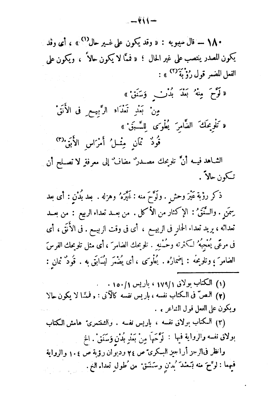 قال سيبويه: وقد يكون على غير الحال أي: وقد يكون المصدر ينتصب على غير الحال: فمها لا يكون حالا ويكون على الفعل المضمر، قول رؤبة:
