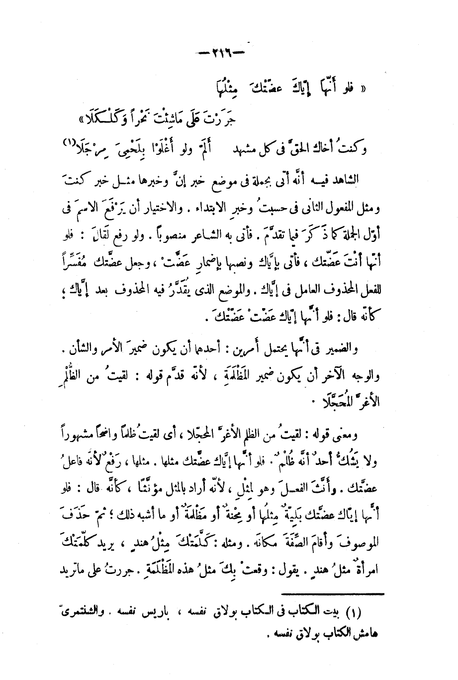 والوجه الآخر أن يكون ضمير المظلمة، لأنه قدم قوله: (لقيت من الظلم الأغر المحجلا). ومعنى قوله: (لقيت من الظلم الأغر المحجلا) أي لقيت ظلما واضحا مشهورا، لا يشك أحد إنه ظلم. فلو أنها إياك عضتك مثلها: (مثلها) رفع لأنه فاعل (عضتك)، وأنت الفعل وهو لـ (مثل) لأنه أراد بالمثل مؤنثا، كأنه قال: فلو أنها إياك عضتك بلية مثلها أو محنة أو مظلمة أو ما أشبه ذلك، ثم حذف الموصوف وأقام الصفة مكانه. ومثله قولك: كلمتك مثل هند. يريد: كلمتك امرأة مثل هند.