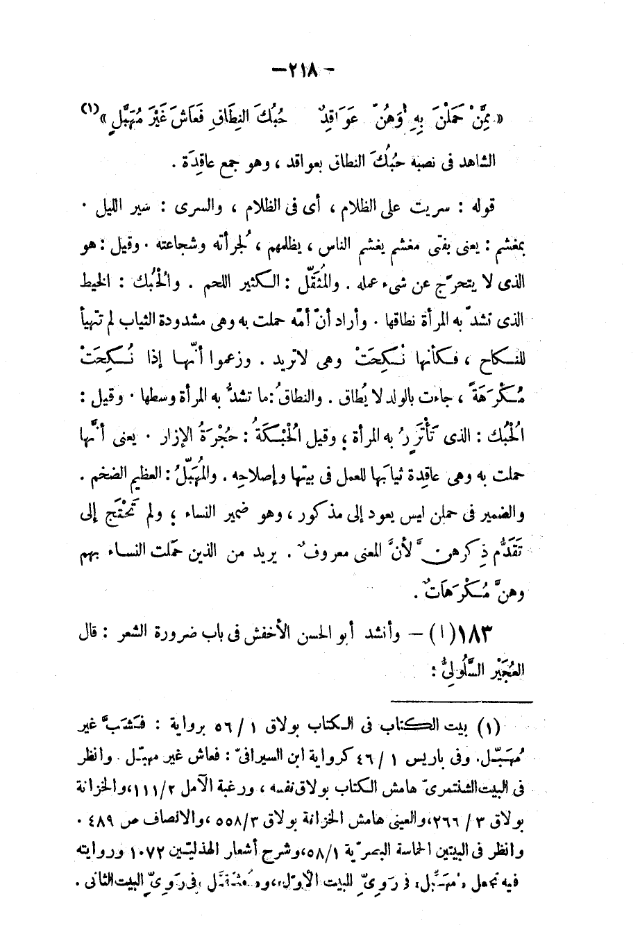 الشاهد في نصبه (حبك النطاق) بـ (عواقد) وهو جمع عاقدة.