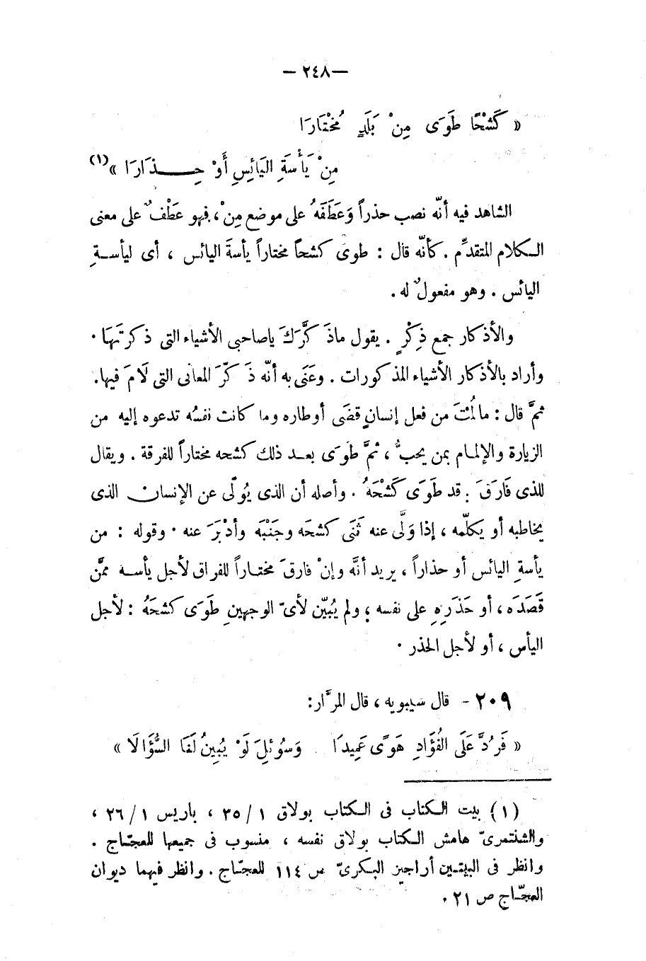 الشاهد فيه إنه نصب (حذارا) وعطفه على موضع (من) وهو عطف على معنى الكلام المتقدم، كأنه قال: طوى كشحا مختارا يأسة اليائس، أي ليأسة اليائس، وهو مفعول له.