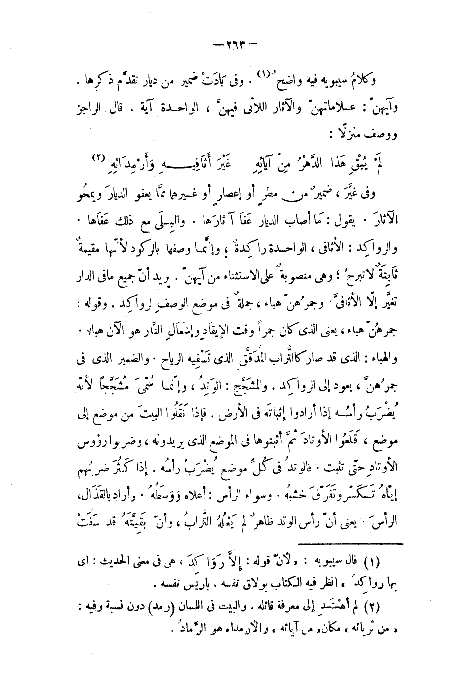 والهباء: الذي صار كالتراب المدقق الذي تسفيه الرياح. والضمير الذي في (جمهرهن) يعود إلى الرواكد، والمشجج: الوتد، وإنما سمي مشججا لأنه يضرب رأسه إذا أرادوا إثباته في الأرض، فإذا نقلوا البيت من موضع إلى موضع؛ قلعوا الأوتاد ثم أثبتوها في الموضع الذي يريدونه، وضربوا رؤوس الأوتاد حتى تثبيت.