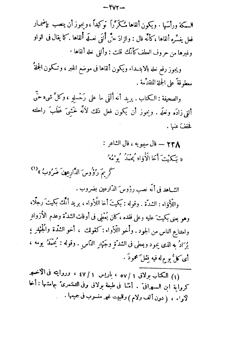 (بَكَيْتُ أخا الّلأْواءِ يُحْمَدُ يومُه ... كريمٌ رؤوسَ الدارعين ضروبُ)