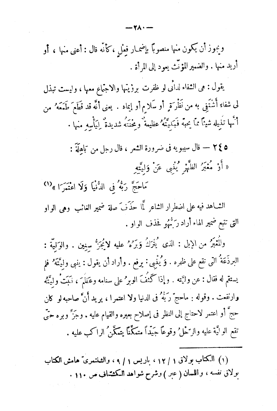 الشاهد فيه على اضطرار الشاعر لما حذف صلة ضمير الغائب، وهي الواو التي تتبع الضمير (الهاء) أراد: ربهو، فحذف الواو.
