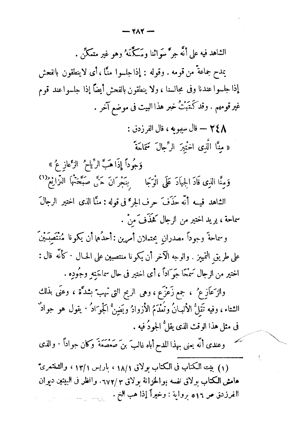 الشاهد فيه إنه حذف حرف الجر في قوله: منا الذي اختير الرجال سماحة، يريد اختير من الرجال فحذف (من)، و (سماحة وجودا) مصدران يحتملان أمرين: