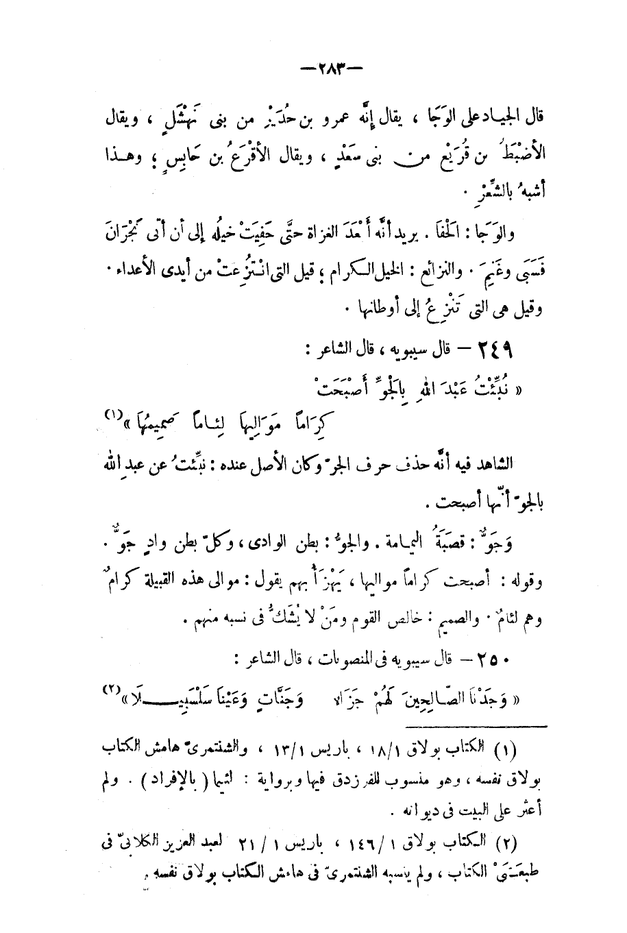 الشاهد فيه إنه حذف حرف الجر، وكان الأصل عنده: نبئت عن عبد الله بالجو أنها أصبحت. وجو: قصبة اليمامة، والجو: بطن الوادي وكل بطن واد جوّ. وقوله: أصبحت كراما مواليها، يهزأ بهم، يقول: موالي هذه القبيلة كرام وهم لئام. والصميم: خالص القوم ومن لا يشك في نسبه منهم.