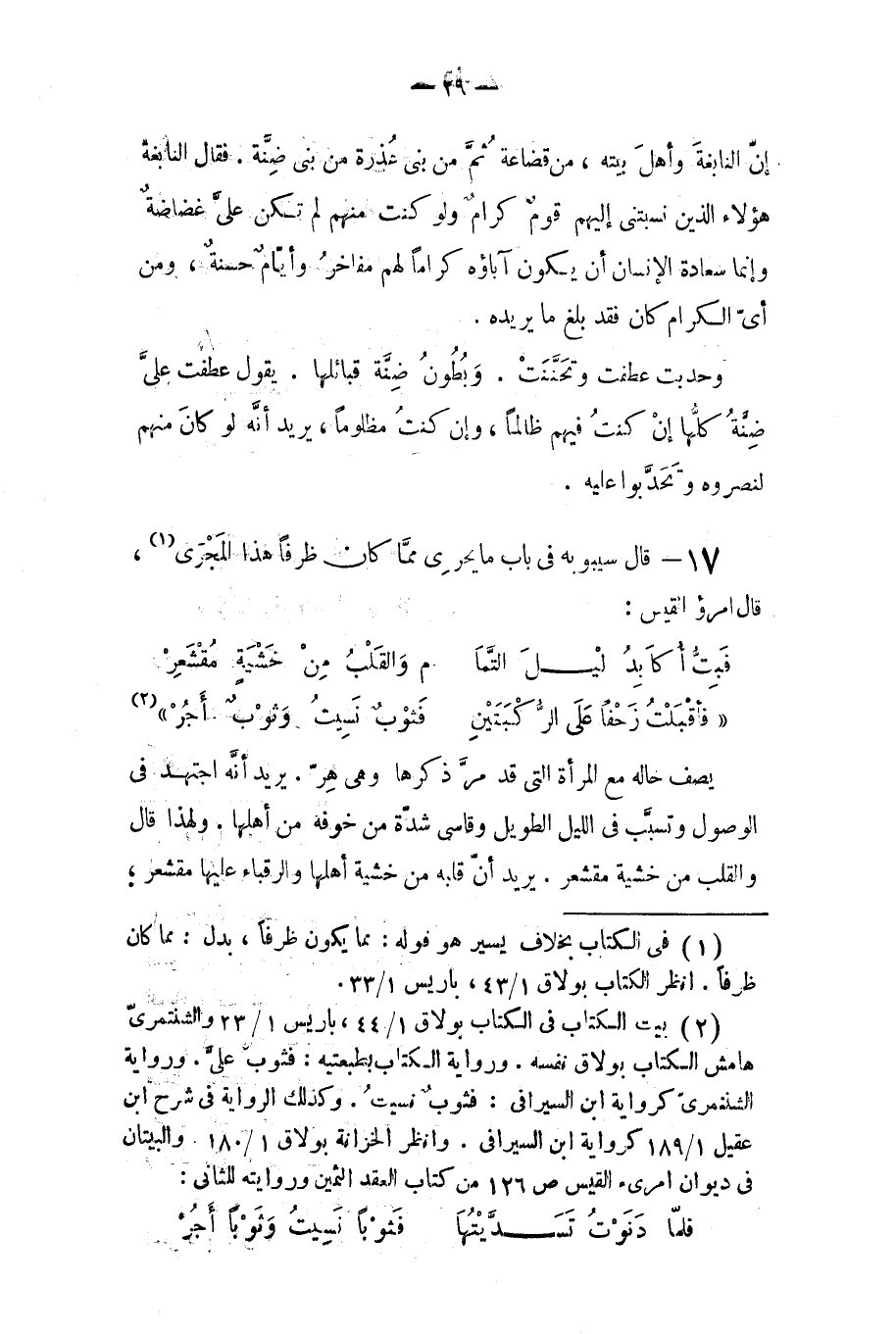 أن النابغة وأهل بيته من قضاعة ثم من بني عذرة من بني ضنة، فقال النابغة: هؤلاء الذين نسبتني إليهم قوم كرام، ولو كنت منهم لم تكن علي غضاضة، وإنما سعادة الإنسان أن يكون آباؤه كراما، لهم مفاخر وأيام حسنة، ومن أي الكرام كان فقد بلغ
